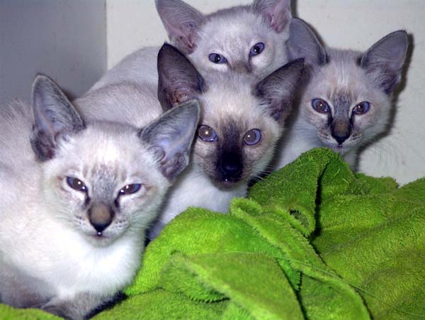 Four Happy Javanese/Balinese Kittens! Two of these little guys now co-own the Main Hotel in Belize with their people. They can be found lounging in the lobby waiting to greet guests, busy doing chores or riding the elevator. Please give them a kiss for us if you visit.