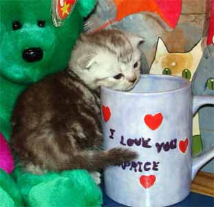 An eMail arrived one day from a young lady named Chelsea who had a 'hole in her heart' Well, Chelsea was looking for a kitten and we had this little baby silver tabby boy that seemed to fit what she was looking for. We didn't know but Chelsea was in love with anything silver so she just couldn't resist this little guy. "Dear David and Caprice,
