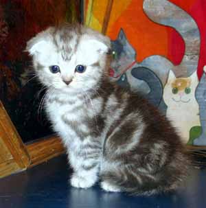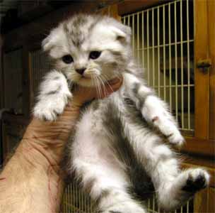 He was so young at this point that we didn't even know if he would have folded ears or not. Chelsea wanted him anyway! His ears did fold and he is now a perfectly happy beautiful boy living the 'life of Riley' in California with Chelsea, her mom Nancy and many birds, a dog and three cats that he calls his friends.